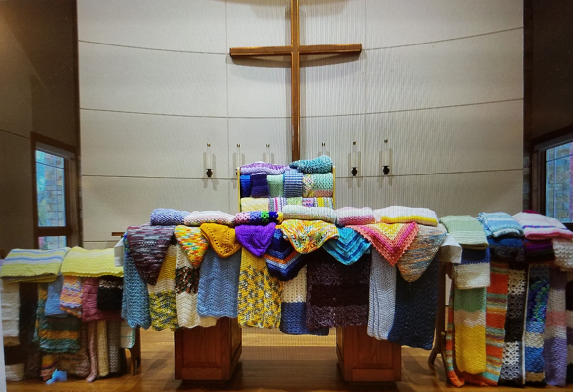 The prayer shawl ministry group meets once a month to make prayer shawls that are given to the newly baptized, those who are part of the visitation ministry, and are available for any one in need of comfort and prayer.