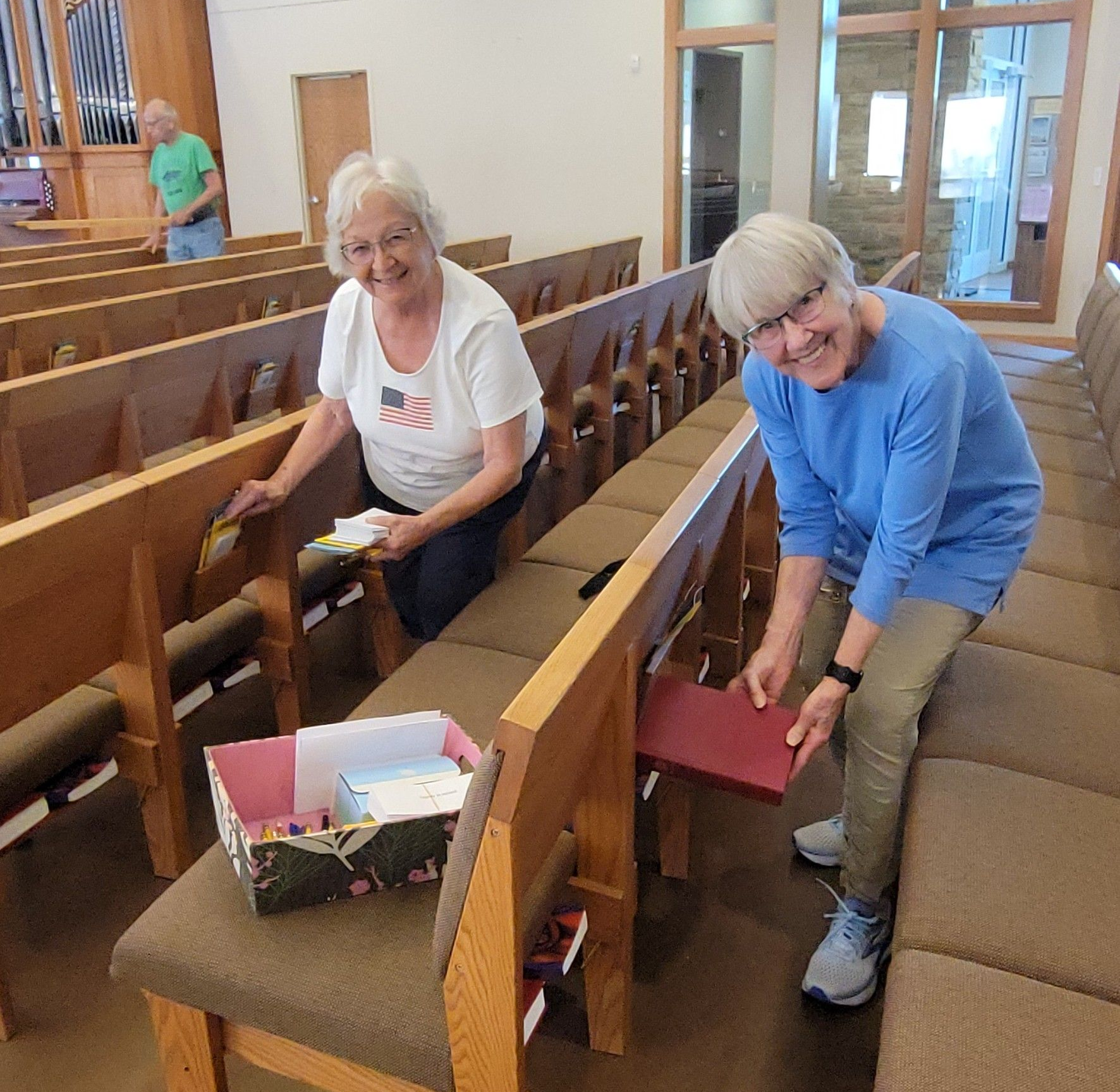 The pewkeeper group meets on Thursday mornings and organizes the pew racks and straightens the pews for weekend services.